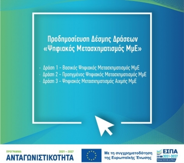 Με στόχο την αντιμετώπιση της υστέρησης των ελληνικών επιχειρήσεων στην ενσωμάτωση ψηφιακών τεχνολογιών, προδημοσιεύεται η Δράση «Ψηφιακός Μετασχηματισμός Μικρομεσαίων Επιχειρήσεων» προϋπολογισμού 300 εκατ. ευρώ, που εντάσσεται